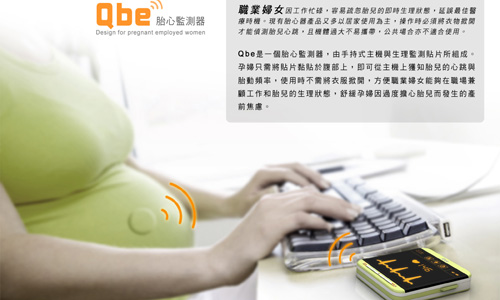 職業婦女因工作忙碌或工作性質不允許,容易疏忽腹中胎兒的即時生理狀態,延誤最佳醫療時機。現有胎心器產品又多以居家使用為主,操作時必須將衣物掀開才能偵測胎兒心跳,且機體過大不易攜帶,公共場合亦不適合使用。 Qbe是一個胎心監測器,由手持式主機與生理監測貼片所組成。孕婦只需將貼片黏貼於腹部上,即可從主機上獲知胎兒的心跳與胎動頻率,使用時不需將衣服掀開,方便職業婦女能夠在職場兼顧工作和胎兒的生理狀態,舒緩孕婦因過度擔心胎兒而發生的產前焦慮。 |