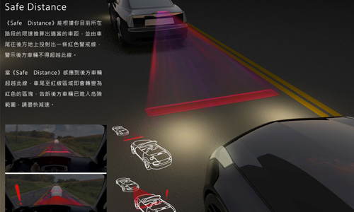 《Safe Distance》能依照您的車速推算出適當的車輛安全距離後,由車尾往後方地上投射出一條紅色警戒線,警示後方車輛不得超越此線,以示安全。當《Safe Distance》感應到後方車輛超越此線,車尾至紅線區域即會轉變為紅色的區塊,告訴後方車輛已進入危險範圍,請盡快減速。 |