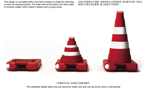 攜帶式交通錐此設計為便攜式交通錐,透過伸縮方式延展高度,增加警示效果。底部水箱設計可灌水增加重量,遇上強風也不易傾倒。 Portable traffic cone This design is a portable traffic cone that increases its height by extending to serve its warning function. The water tank at the bottom can store water to increase weight, which makes it steady even in gusty winds. |